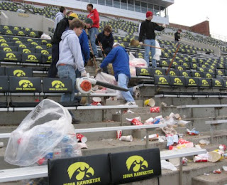 While in high school in Iowa City, all fall sports athletes were required to arrive at 7am on Sunday morning to clean the stadium after a home game. The university donated the money we raised to the athletic programs of each high school. If enough people showed up (usually 200-500 people), it could be fully cleaned in under 2 hours. It’s a win-win for all parties!