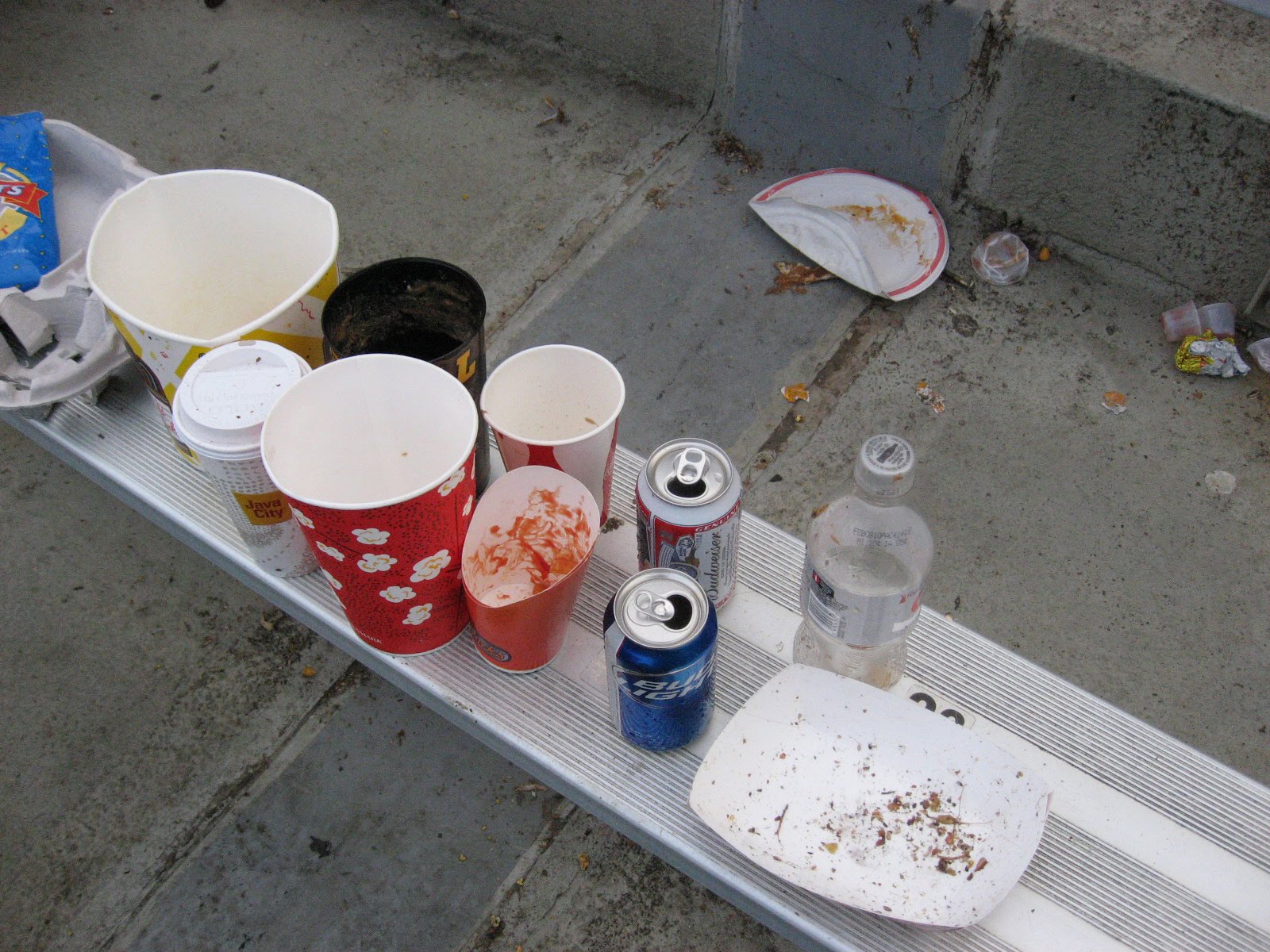 During the cleanup process, the trash is swept into the aisle, and then forced into a trash bag. Even with people walking around looking for bottles, there were many of them that still ended up in the trash. Everyone is trying to get the job done, and aren’t spending a lot of time looking to see what can be pulled out for recycling.